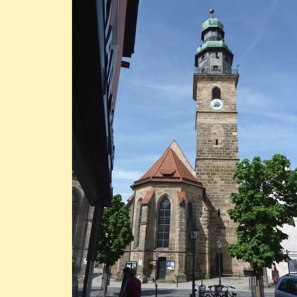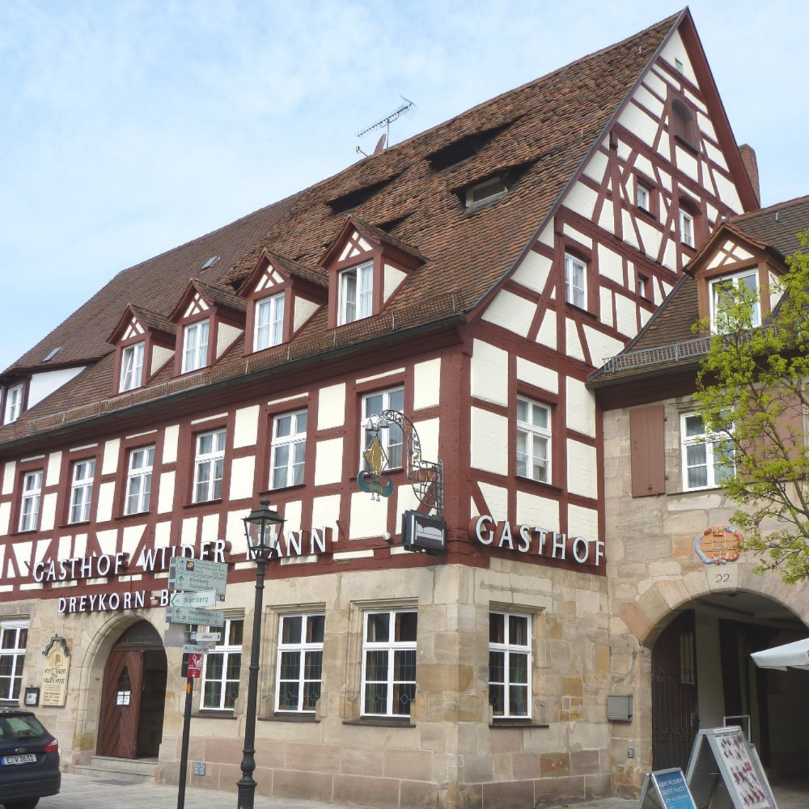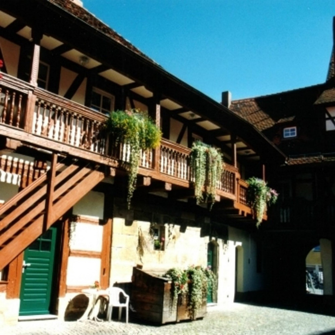 Die sogenannte Fürstenherberge Gasthof "Wilder Mann" wurde 1414 erstmals erwähnt, als der Reformator Hus auf der Durchreise hier Station machte. Ausnahmsweise schaut nicht der Giebel, sondern die Traufseite zum Marktplatz. Durch das rechts daneben liegende Tor gelangt man in den sehenswerten Innenhof (siehe nächstes Bild).