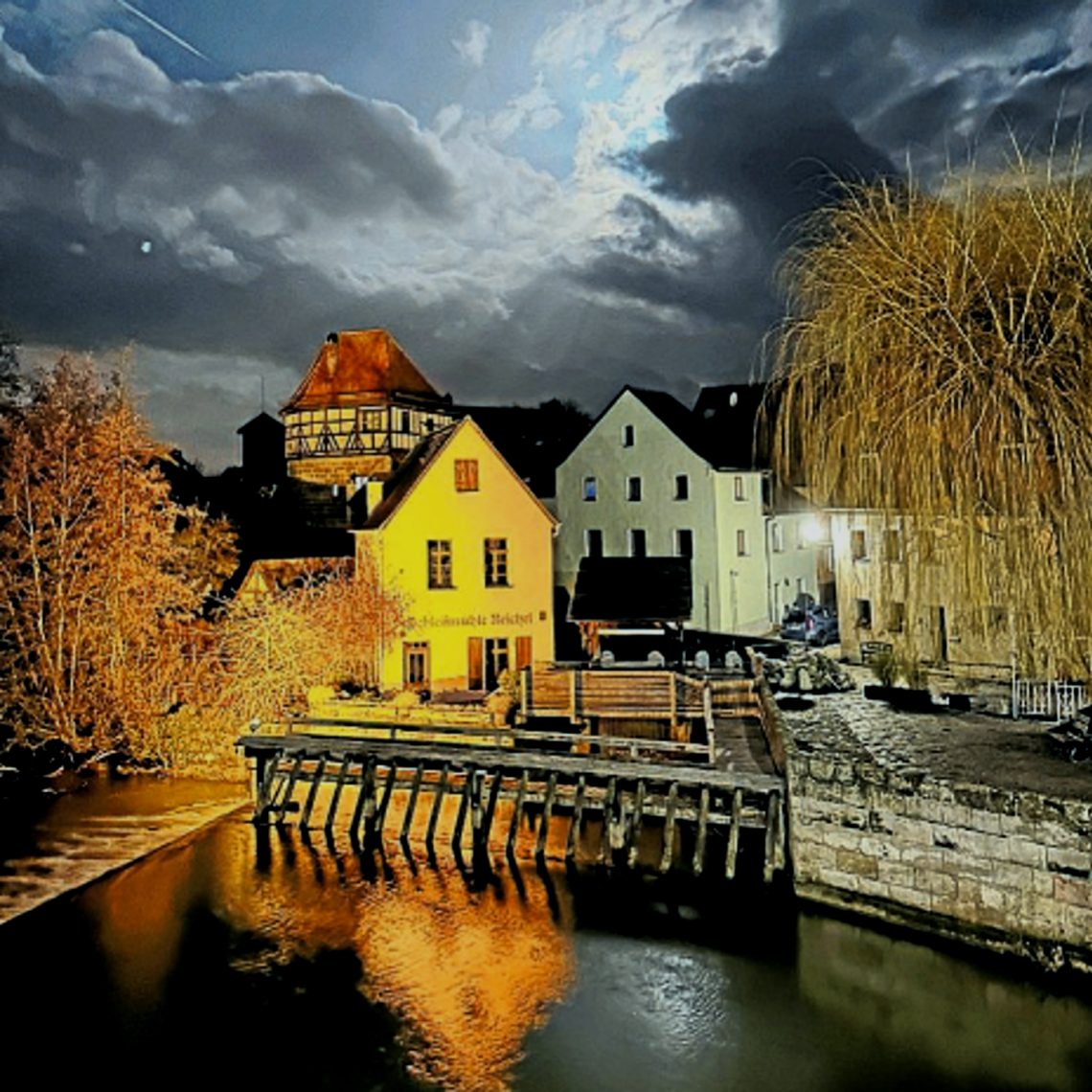 Besondere Gebäude wie hier die Schleifmühle werden bei Nacht stimmungsvoll beleuchtet. Nur das Rauschen des Wassers, das über das erste von drei Wehren strömt, bleibt Tag und Nacht gleich.
