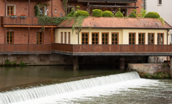 Heute erinnern die in den Fluss ragenden Gebäudeteile an die schräg hintereinander angebrachten Mühlräder. Darunter verbirgt sich jedoch ein automatisches Klappenwehr, das die Wasserhöhe selbsttätig regelt.