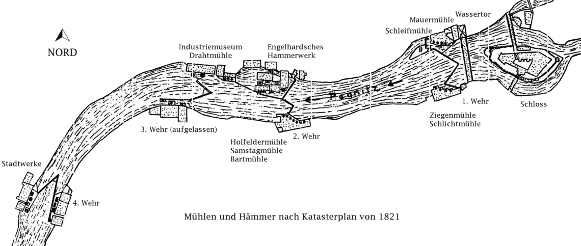 Das starke Gefälle erlaubte eine Vielzahl von Mühlen, die sich an beiden Ufern der Pegnitz ansiedelten. 1596 zählte man neben den Getreidemühlen zwölf Hammerwerke für Blech und Messing, vier Sägemühlen, zwei Schleifmühlen und eine Lohmühle zum Zerkleinern von Eichenrinde, die zum Gerben von Leder benutzt wurde. Insgesamt bewegte der Fluss 50 Wasserräder.