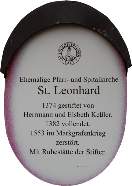 Im Zusammenhang mit der wohltätigen Spitalstiftung des Ehepaar Hermann und Elsbeth Kesslers gelang es den Stiftern im Jahr 1375 mit Genehmigung des Bamberger Bischofs eine eigene Pfarrei Lauf zu gründen, die Stelle eines Pfarrers zu finanzieren und diese von der Muttergemeinde Neunkirchen am Sand abzutrennen. Gleichzeitig mit dem Bau des Spitals wurde die dazugehörige Pfarrkirche St. Leonhard im selben Jahr in Holzbauweise errichtet. St. Leonhard war damit nicht nur die Spitalkirche, sondern Laufs erste unabhängige Pfarrkirche neben der als „Capella“ bezeichneten Filialkirche St. Johannis.1382 folgt auf den Holzbau der jetzt noch ersichtliche massive Baukörper, um den herum der Friedhof angelegt wurde.