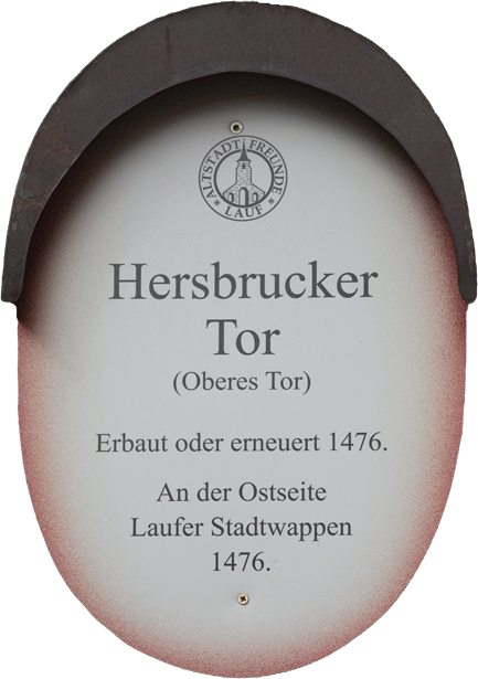 Der Weg auf der Goldenen Straße Richtung Prag führt durch das Hersbrucker Tor. Mit dem mächtigen Turm und seinem außen hoch über dem Tor angebrachten Wappen demonstrierten die Laufer stolz, dass sie die Stadtrechte verliehen bekommen hatten. Sie durften den Ort befestigen, das zeigen die beiden Türme neben dem Wappenschild mit dem halbierten Adler und den roten und silbernen Streifen. (Heraldiker verwenden statt „weiß“ die Bezeichnung „silbern“, ebenso wie „gelb“ immer „golden“ genannt wird.)
