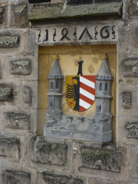Die Inschrift über dem Wappen mag rätselhaft erscheinen, doch sie gibt Auskunft über das Jahr der Fertigstellung des Turms: das erste Zeichen ist noch klar eine Eins, dann folgt eine Schleife, bestehend aus einer Acht, von der nur die obere Hälfte ausgeführt ist – also eine Vier. Die dritte Ziffer stellt keinen Rückgriff auf römische Ziffern dar, sondern ist eine Sieben, die (vielleicht aus Symmetriegründen) nach links gekippt ist. Die letzte Ziffer ist wieder klarer, eine Sechs. Zusammen ergibt sich die Jahreszahl 1476.