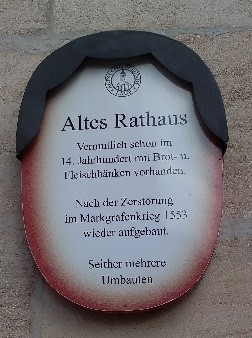 Es handelte sich um einen rechteckigen Bau, der zweistöckig war. Im Erdgeschoß befanden sich Läden, vorzugsweise Brot- und Fleischbänke der Bäcker und Metzger. Im Obergeschoß befand sich der Rathaussaal für Sitzungen, Verhandlungen und festliche Veranstaltungen. Auf dem hohen Satteldach befand sich ein kleines Glockentürmchen. Im Markgrafenkrieg 1553 brannte das Gebäude völlig aus. Der Schaden, der hierbei entstand, wurde auf 3000 Gulden veranschlagt. Die Wiederherstellung glich einem Neubau, wobei das Erdgeschoss auf dem alten Grund in Sandstein, das Obergeschoß ebenso wie die Giebel in Fachwerk ausgeführt wurde. 1603 kam es zu einem Umbau, wobei der Westgiebel und das ganze Obergeschoss abgebrochen und in Sandstein gebaut wurde. An der Ostseite stand quergestellt ein dreigeschossiger Wohnhausbau.