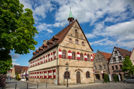 Der Markt Lauf liegt an einer bedeutenden Handelsstraße, die an dieser Stelle zu einem breiten Straßenmarkt verbreitert wird und in dessen Mitte befindet sich das freistehende Rathaus. Es stand nicht am Rande, eingerückt in die Front der Bürgerhäuser, sondern unübersehbar beherrschend in der Mitte des Platzes als zentraler Ort der Ratsversammlung, des Stadtregiments, der Gerichtssitzungen und als Markthalle.