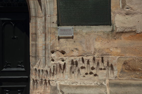 An den Kirchenportalen außen erzählen Wetzrillen vom mittelalterlichen Glauben an die Heilkraft des Steinstaubes, den man dem Essen beifügte. Eine Messingtafel am Südeingang von 1495 weist auf eine Bürgerstiftung eines Hans Leibgeb hin.