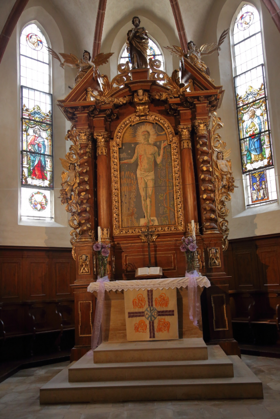 Der Schreinermeister Balthasar Götz schuf nach italienischem Vorbild 1691/92 einen Wechsel-Altar mit 7 verschiedenen Bildern. Je nach Kirchenjahreszeit erzählen sie von der Geburt und Taufe Jesu, dem Einzug in Jerusalem, dem letzten Abendmahl, der Kreuzigung, der Auferstehung und dem Pfingstwunder. Initialen und Wappen erinnern an die Stifterfamilien. Das Malerehepaar Keil porträtierte auch Bürger und Bürgerinnen der damaligen Zeit. Das macht die Tafeln zu Dokumenten der Stadtgeschichte.