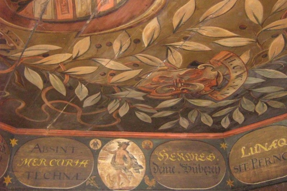 Die obere Laterne bestand aus einem einzigartigen, holzvertäfelten Sommerzimmer, das mit römischen Gottheiten und Sinnsprüchen ausgemalt wurde.