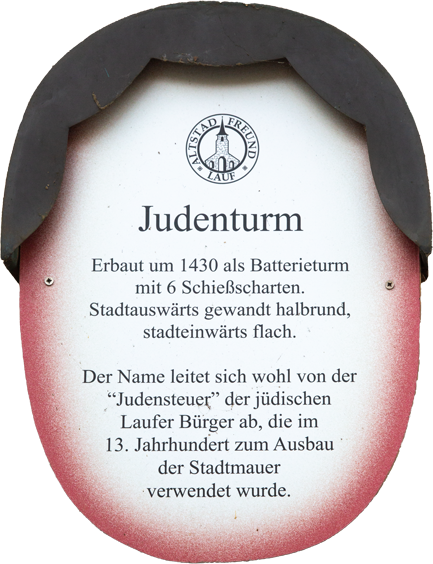 Wie lässt sich das finanzieren? Bereits 1347 wird der Nürnberger Judeneid auch im Laufer Stadtbuch vermerkt. Im Jahr 1430 erhielt Lauf vom damaligen Landesherrn schließlich das Recht, über eine sogenannte Judensteuer zu verfügen.