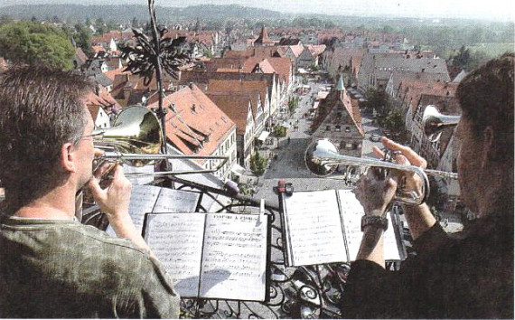 Auf dem Turm spielen die Haberloher unterhaltsame Weisen: