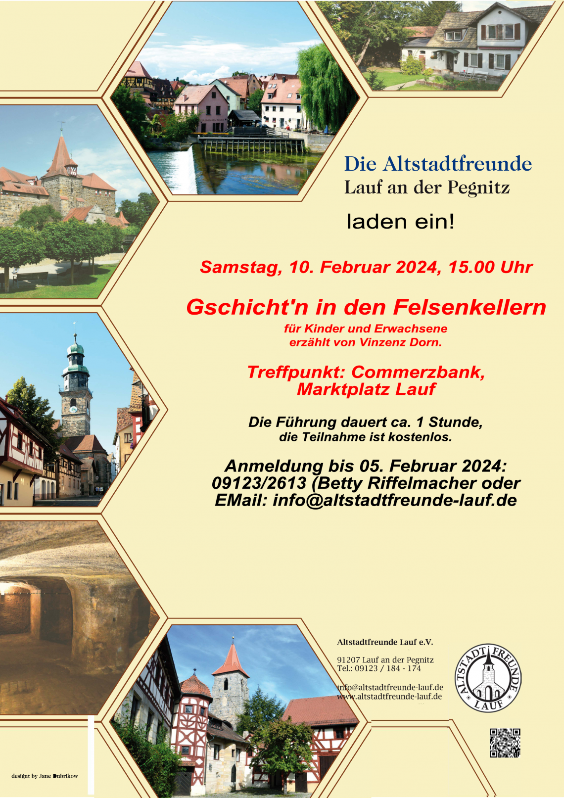 Die Altstadtfreunde Lauf e. V. laden am Samstag, 10. Februar 2024, 15.00 Uhr zu einer Kellerführung mit Vinzenz Dorn ein. Alte Keller haben immer auch etwas Unheimliches: Was verbirgt sich in den finsteren Ecken, im Schatten? Dazu passen mysteriöse Geschichten und Sagen, die sich mit der Dunkelheit, der tropfenden Feuchtigkeit, der ungewohnten Stille, dem Gefühl, eingeschlossen zu sein verbinden. Fünf solcher "Gschicht’n in den Felsenkellern", abgestimmt auf die jeweilige Station, erzählt Vinzenz Dorn während der Führung.
