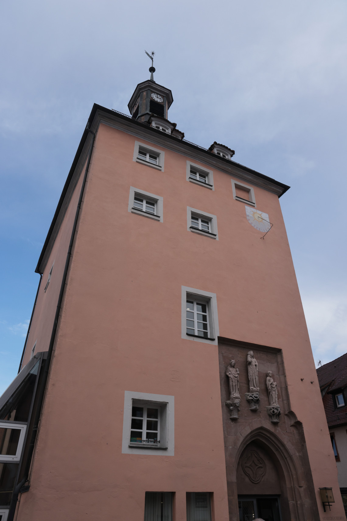 Im Rundgang durch die ehemalige Klosteranlage und durch die Stadt wandelten wir am Klosterbrunnen, an der Klostermühle, an der Katharinenkapelle, am Rathaus und an dem kuriosen Umbau der Heilsbronner Spitalkirche vorbei. Gerade in der ehemaligen Katharinenkapelle, die wir durch ihren viereckigen, für eine Kapelle ungewöhnlichen, ansonsten unauffällig wirkenden Hochbau für ein Gefängnis, Wohnturm oder Ähnliches gehalten haben, lag das historische Objekt, das die Gästeführerinnen aus Lauf und Heilsbronn, Monika Pöhlmann und Christine Diefenbacher in diesem Jahr zu einem Treffen veranlasst hatten: die Türmerwohnung in einem kirchlichen Gebäude. Der Laufer und der Heilsbronner Turmwächter hatten nahezu die gleichen Hauptaufgaben: Warnung bei entstehender Feuerbrunst und vor etwaigen Feinden, sowie als Musikant für besondere Anlässe. Deshalb beherbergt die ehemalige Katharinen-Kapelle heute ein Musikmuseum neben Bibliothek und Türmerwohnung. Wie in der Einladung zur Exkursion angekündigt, gab es einen Aufzug, der uns die Möglichkeit gab, aus der Türmerwohnung bequem die Aussicht auf die Stadt zu genießen.