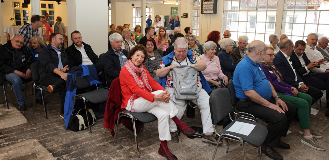 Rainer Turba kramte nun als Moderator mit einer Zeitzeugin und zwei Zeitzeugen in der „Erinnerungskiste“ und jeder zog eine Erinnerung, die sie/er mit der langjährigen Zugehörigkeit zum Verein verbindet. So erzählte Karin Uhlmann von ihren Vorfahren Döring und Muscat und der Geräuschkulisse ihrer Kindheit, die von der Dampfmaschine kam. Baldur Strobel, Vorsitzender der Altstadtfreunde von 2004 bis 2020, hinterlässt mit seinen Sanierungsaktionen in der Schleif‘ und in den Felsenkellern hingegen bleibende Erinnerung. PZ