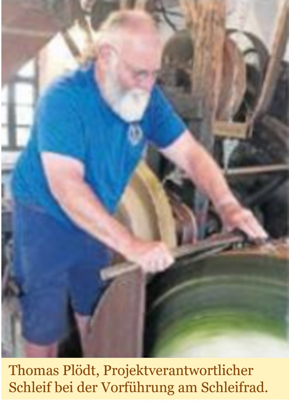 Direkt erleben konnten man das Schleifen von Messern und Äxten in der Schleifmühle Reichel. Auch hier fanden sich meist kleinere Gruppen ein. Ein Vorteil bei den engen Platzverhältnissen. Anschaulich erläuterten auch hier die Ehrenamtlichen das Zusammenwirken von Schaufelrädern, Transmissionsriemen, Wasser und Schleifstein. Oft wurde bedauert, das Lieblings-Küchenmesser oder die kleine Axt gerade nicht dabei zu haben. Das kann nachgeholt werden. Termine über den Betrieb „der Schleif“ findet man auf der Internetseite der Altstadtfreunde.