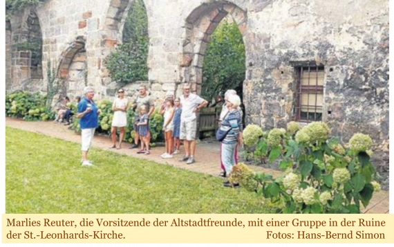 Ehrenamtliche Mitglieder des Vereins erzählten lebendig die Geschichte des Ensembles. Beeindruckt waren viele Besucherinnen und Besucher vom Grab des Stifterehepaares Kessler, das sich – freigelegt und gepflegt durch die Altstadtfreunde – immer noch in der Ruine befindet. Vielleicht, weil teilweise eher Familien geführt wurden, hatten viele kleinere Besucher den Mut, interessiert zu fragen und fanden das Wie und Wo recht spannend.