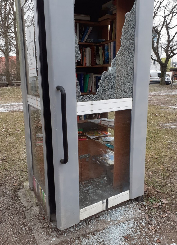 Bei dem Bücherschrank, der in der Grünanlage in der Nähe der Schule steht, handelt es sich um eine ausrangierte Telefonzelle. Die Altstadtfreunde haben sie vor sechs oder sieben Jahren mit viel ehrenamtlichem Engagement umgebaut, der Künstlerkreis hat sie gestaltet. „Es kam dort immer wieder zu Vandalismus, aber so schwer wie jetzt wurde die Telefonzelle noch nie beschädigt“, sagt Pöhlmann. Vermutlich mit einem schweren Gegenstand zertrümmerte der Unbekannte die Frontscheibe aus Verbundglas. Die Scherben verteilten sich dabei rund um den Bücherschrank.