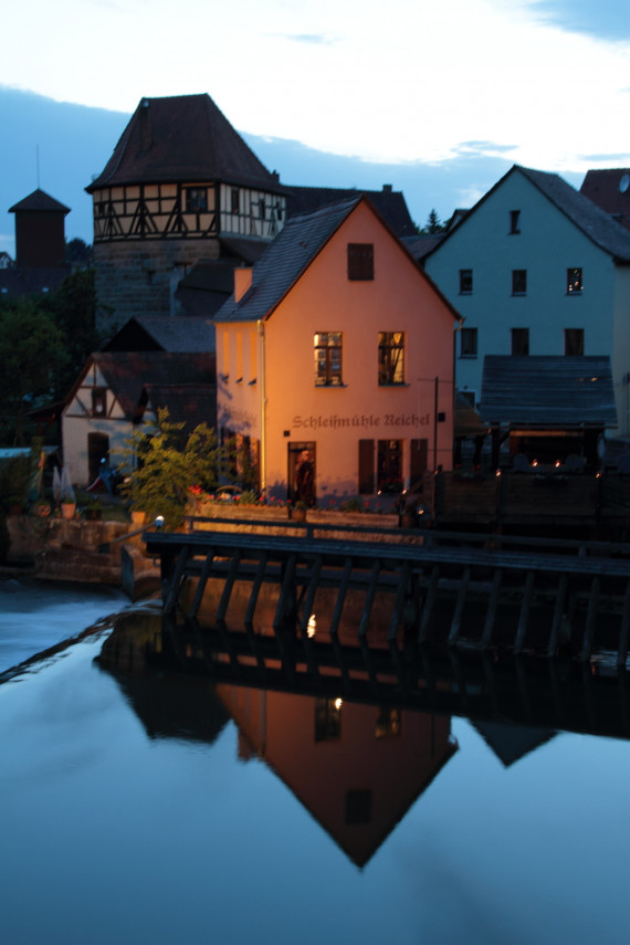 Beleuchtung kleines und großes Wasserrad an der Schleifmühle.