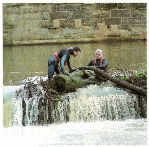 Altstadtfreunde organisieren Arbeitseinsatz mit Wasserwacht und Technischem Hilfswerk zum Entfernen angeschwemmter Bäume am Wehr.
